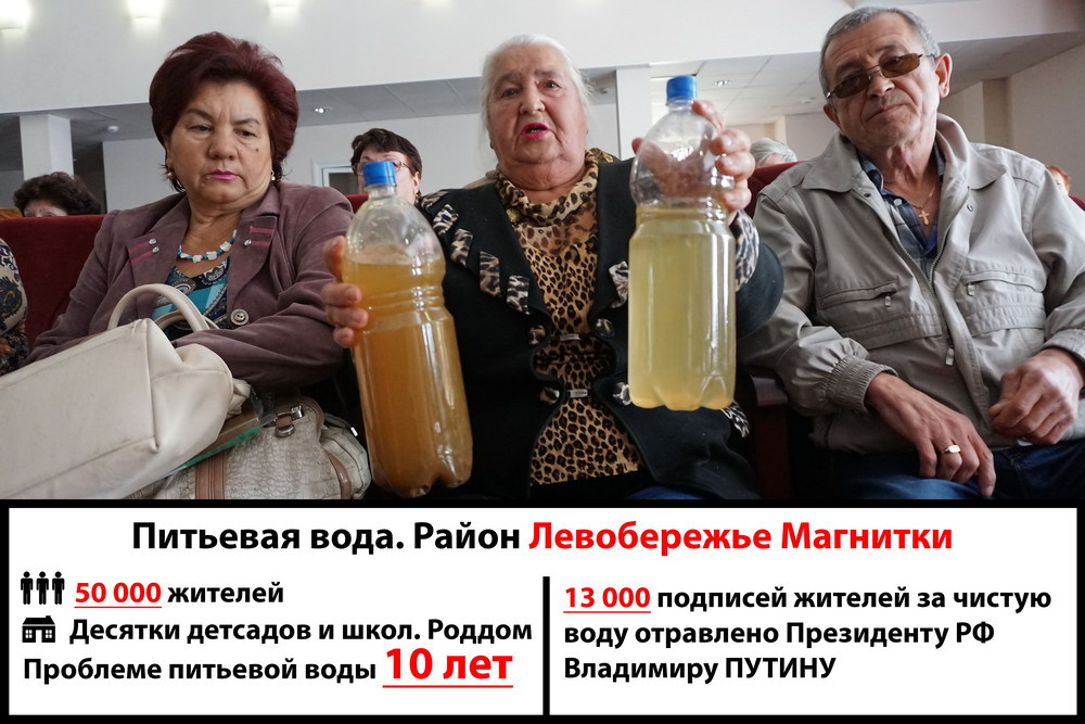 Проблеме грязной воды на Левом берегу десять лет. Год от года вода становится все хуже и хуже. Например, за три летних месяца 2015 года, по подсчетам председателя КТОСа поселка Димитрова Анатолия Костина, дней с более-менее нормальной водой было всего 17. Эту воду (на картинке ниже) невозможно пить, ею невозможно стирать вещи и купать детей. На Левом берегу люди давно не рискуют покупать белые вещи – после первой же стирки их приходится выкидывать. А в октябре «левобережники» отправили Президенту РФ Владимиру Путину 13 тысяч подписей земляков с просьбой помочь в решении «водной проблемы». Поэтому мы от имени общественного движения «Левобережье Магнитки» специально подготовили для журналистов, присутствовавших на пресс-конференции, и лично для Бориса Дубровского наглядную картинку.