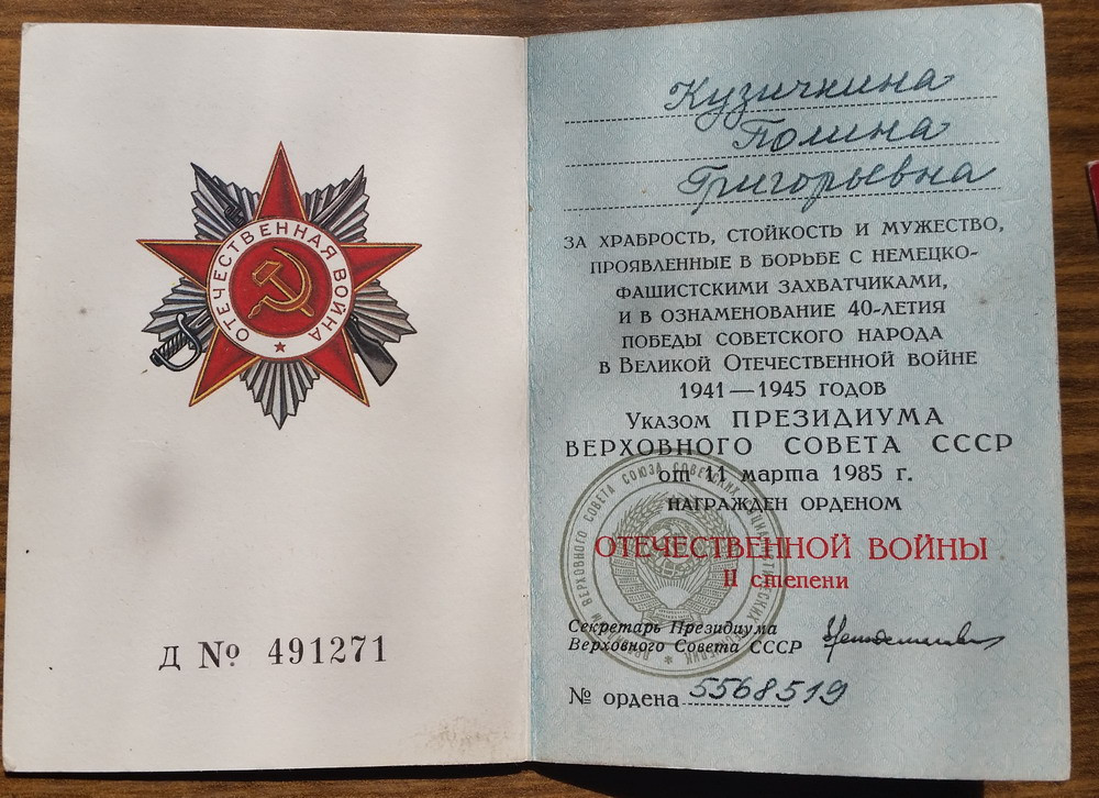 В прошлом году я познакомилась с удивительным человеком – Полиной Григорьевной Кузичкиной. В свои 93 года она остается веселой, неунывающей женщиной. Видя ее задорные молодые глаза, никак не могу назвать ее бабушкой. Она умеет радоваться жизни, любить людей и интересно рассказывать о своей жизни. А с какой гордостью она вместе с городским союзом десантников проезжает в открытом УАЗике под флагами ВДВ – в голубом берете, с орденами и медалями на груди! Так было в прошлом году. Так будет и в нынешнем. Вчера, 5 мая, она вместе с десантниками посетила концерт «Голубых беретов» в Верхнеуральске. Смотрю на нее – и не верится, что эта скромная и миниатюрная женщина отдала всю свою молодость войне, прошагав в прямом смысле слова пол-Европы…
