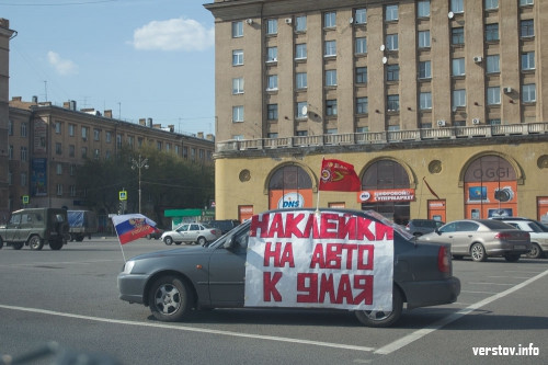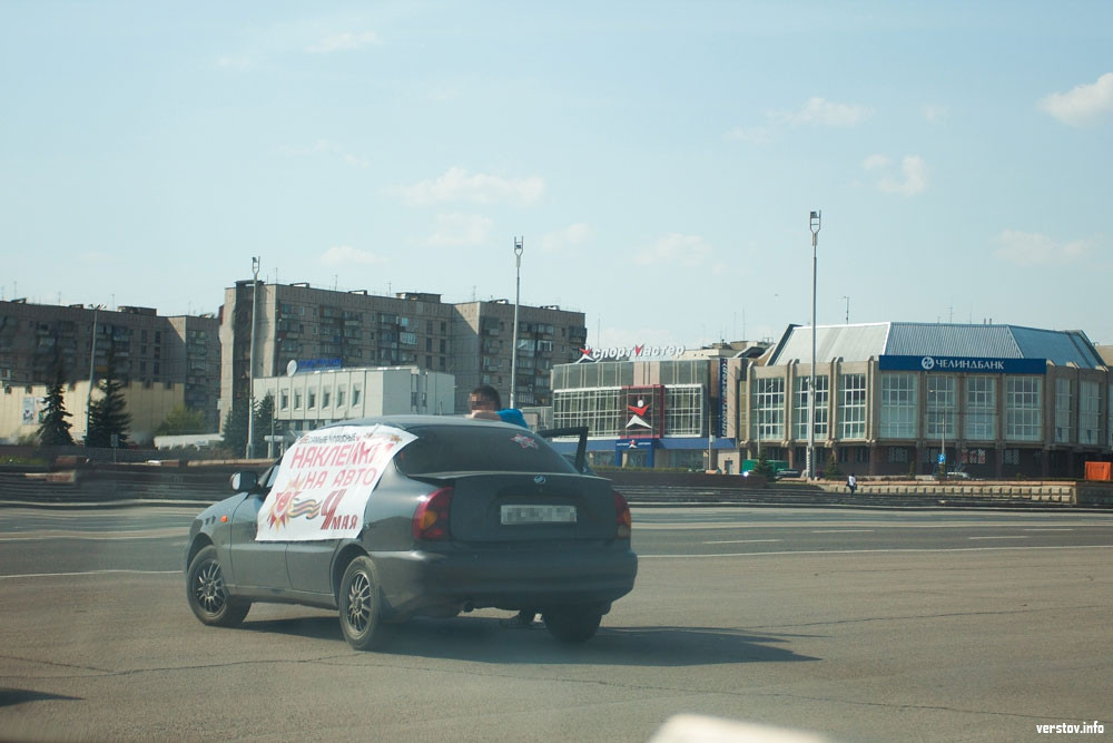 Магнитогорск. Перед празднованием Дня Победы город накрыла истерия с символами Победы. Одни втюхивали наклейки каждому встречному, другие эти наклейки прикрепляли к стеклу, думая, что отблагодарили конкретного участника войны за его кровь, пот и труд. Первые нажились, вторые надеялись, что исполнили долг.