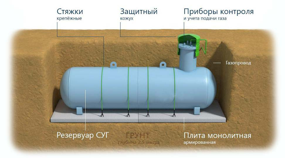 Система автономного газоснабжения куда менее затратная, чем протягивание магистральной ветки, но самое главное — вам не придется зависеть ни от каких внешних факторов, это подземное хранилище только ваше. Газгольдер в виде специального герметичного кессона помещается под грунтом на приусадебном участке, заправляется сжиженным газом, и по трубам низкого давления подается в дом. В зависимости от расхода раз в несколько месяцев хранилище заполняется специализированной организацией. Этот вариант особенно выгоден владельцам частных домов, садовых участков и дач.