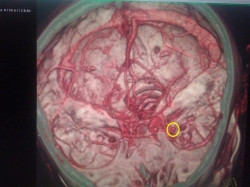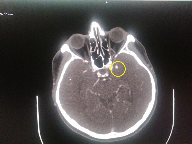 Бывают случаи, когда пациент жалуется на головную боль, частичную потерю или затуманенность зрения, онемение, боль в глазах. Невролог подозревает патологию сосудов головного мозга и направляет человека на МСКТ. Уже на исследовании выясняется, что причиной состояния была аневризма – образование на кровеносном сосуде, которое быстро растет и наполняется кровью. На снимках аневризма выделена кругом. Разрыв ее может привести к кровоизлиянию в головном мозге – это опасное для жизни состояние. При разрыве человек ощущает самую сильную боль, и нуждается в помощи врача.
