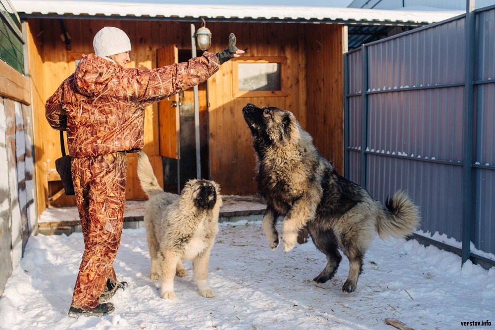 В вольере нас поджидают титулованные среднеазиатские овчарки.