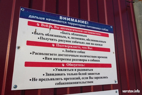 Перед Елимбетово фотограф Алексей сбавляет скорость до требуемой правилами дорожного движения. Наконец, мы съезжаем с трассы на проселочную дорогу. Немного петляем по деревне. Почему-то нам представляется, что собачий питомник будет заметен сразу, как рекламный щит в степи. Но нет, высокий забор, как и у практически всех жителей деревни. Вот только из него выглядывают четыре милых щенка ростом с человека. Как хотелось бы, чтобы тебя действительно встречали щенята, но это всего лишь вывеска, с которой деревенская администрация, к счастью, не борется.