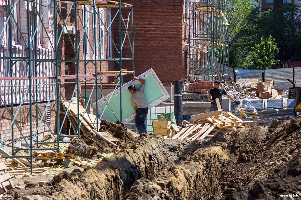 Прошлась делегация во главе с Бердниковым и по второму этажу, и по третьему. Прогулялись даже на крыше здания, где уже уложили кровельный материал бикрост. Везде Бердников находил недоделки.