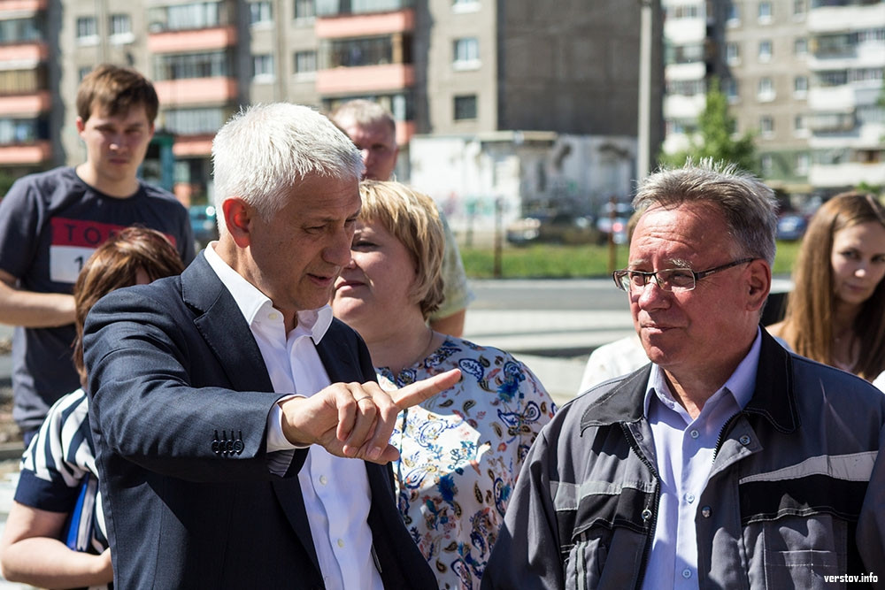 В 15:16 на строительную площадку приехал глава города вместе с исполняющей обязанностями заместителя главы Светланой Тулуповой и начальником городского образования Натальей Сафоновой. Первым делом Сергей Бердников поинтересовался, где строители. Строителей как назло рядом не оказалось, все были заняты своими делами. Наконец, они появились и начали рассказывать, что здесь изменилось со времен последнего визита градоначальника. Бердникова это не устроило.