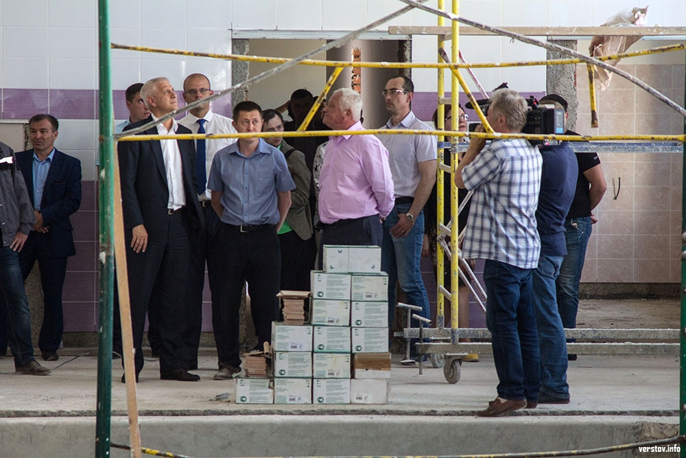 После этого глава пошел осматривать само помещение школы. Начали с бассейна, затем делегация посмотрела душевую, оценила работу штукатуров. Прошлась делегация по актовому залу, посетила столовую. Мягко говоря, градоначальник оказался недоволен многим – везде строители не успевали по графику.