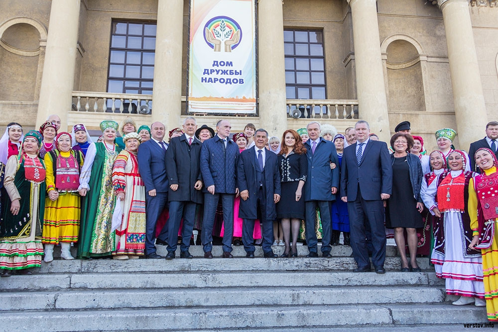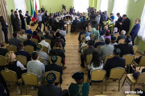 После фотосессии в фойе нарядные девушки вынесли гостям каравай и большой чак-чак. Минниханову предложили вкусить каравай, Дубровскому и Рашникову – чак-чак. Затем делегация последовала сначала в актовый зал, а после – в малый зал, где их ждала татарская община. Спикером на встрече выступил заместитель премьер-министра Республики Татарстан, председатель Национального совета Всемирного конгресса татар Василь Шайхразиев.