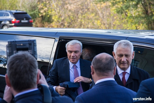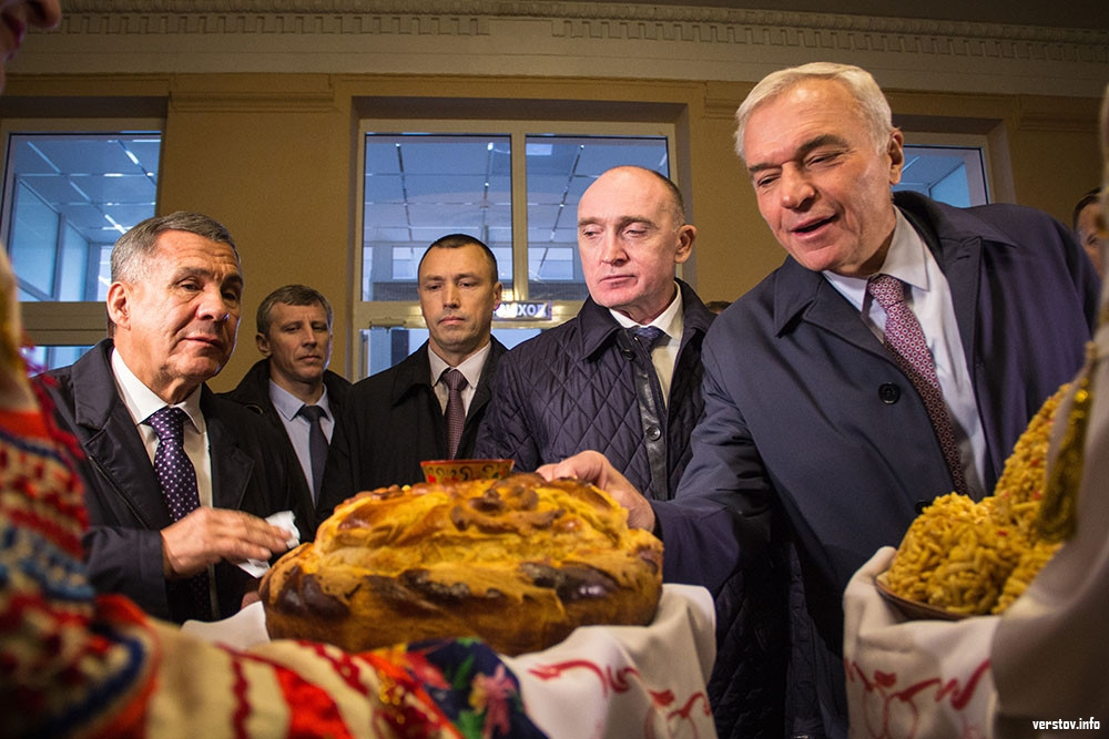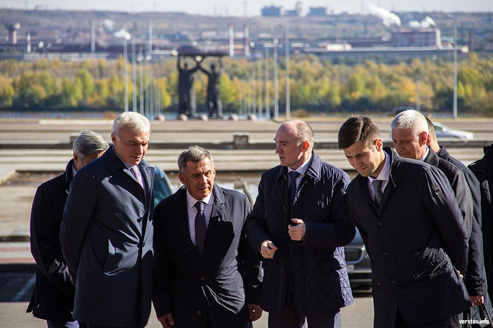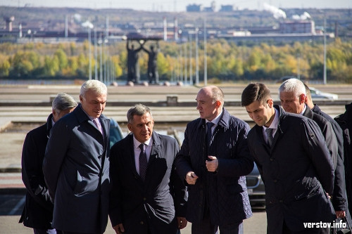 Подъехал кортеж. Из микроавтобуса вышел глава Магнитогорска Сергей Бердников, затем – председатель ПАО «ММК» Виктор Рашников, губернатор Челябинской области Борис Дубровский, президент Татарстана Рустам Минниханов и генеральный директор Магнитогорского металлургического комбината Павел Шиляев.