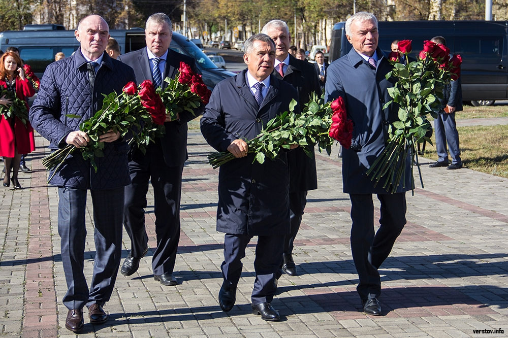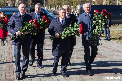После встречи в Доме дружбы народов президент Татарстана Рустам Минниханов вместе с Борисом Дубровским, Виктором Рашниковым, Сергеем Бердниковым и Павлом Шиляевым возложили цветы у памятника Первая палатка.