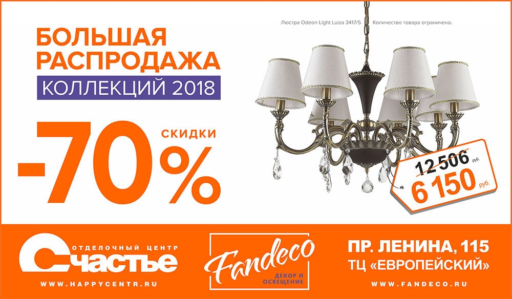 Магнитогорск. Сеть салонов света и декора FANDECO объявляет о большой распродаже коллекций 2018 года. Скидки до 70%!