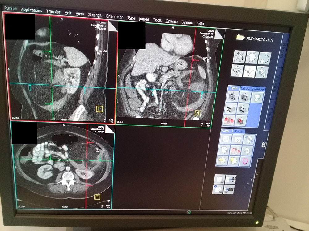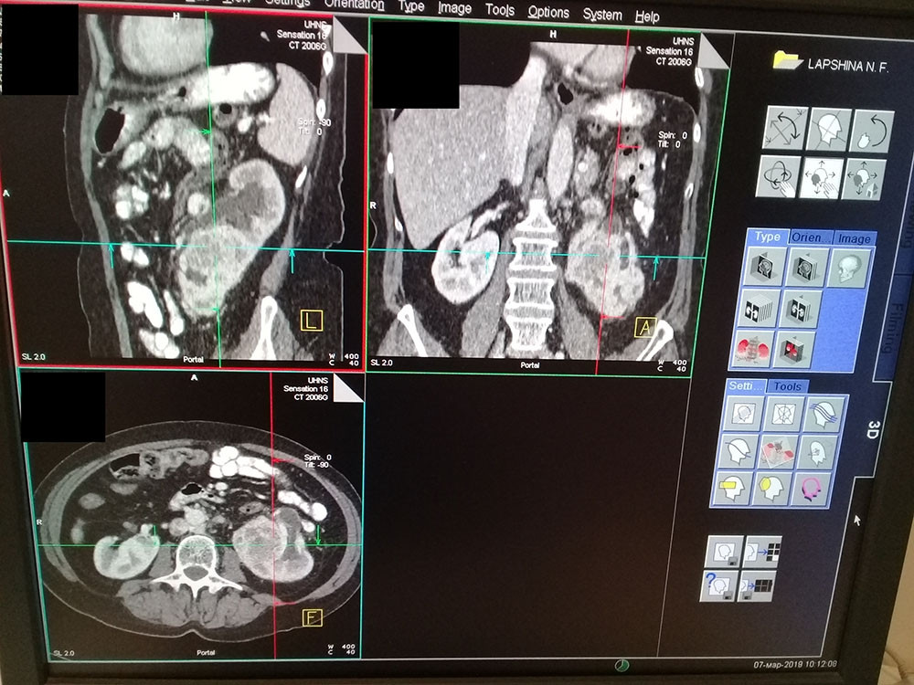 КТ-картина гиперваскулярного образования в нижнем сегменте левой почки с признаками прорастания на уровне соустья лоханки и мочеточника, с наличием опухолевого тромба в левой почечной вене. Окклюзионный гидронефроз слева.