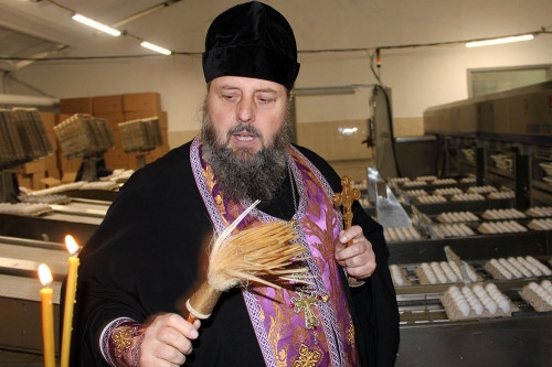 Отец Фёдор, настоятель Свято-Никольского храма, каждый год принимает участие в этой доброй традиции. Батюшка окропляет святой водой не только готовую пасхальную продукцию, но и всё сырьё, а также технологические линии.