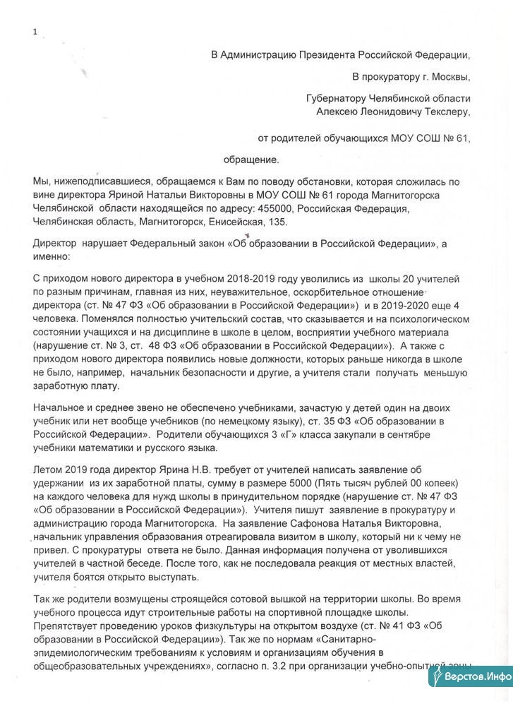 О нездоровой ситуации в школе № 61 стало известно после нескольких постов в популярном сообществе во «ВКонтакте». Сначала там появились фотографии плесени на стенах в столовой образовательного учреждения, позже родители одного из классов решили отстоять классного руководителя, который, по их словам, попал в опалу к директору. Уже после этого родители направили обращение в прокуратуру, губернатору Челябинской области Алексею Текслеру и даже президенту страны Владимиру Путину. В письме они перечислили все претензии к руководителю школы № 61 Наталье Яриной, которая возглавила образовательное учреждение в 2018 году.