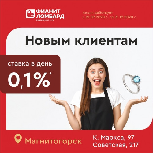 А недавно «Фианит-Ломбард» запустил акцию для новых клиентов. При залоге золота проб 375, 500, 583, 585, 750, 958 и серебряных столовых приборов, слитков, монет или часов процентная ставка составит 0,1 % в день. Предложение действует до 31 декабря 2020 года по двум адресам: пр. Карла Маркса, 97 и ул. Советская, 217.