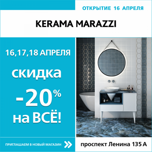 16 апреля ждем вас на торжественное открытие фирменного салона KERAMA MARAZZI по адресу: пр. Ленина, 135а.