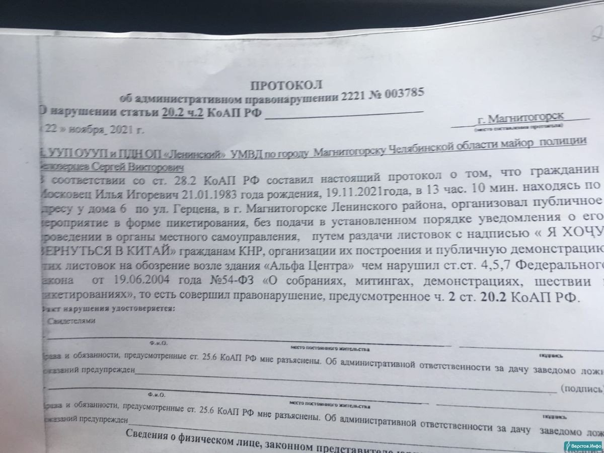 Напомним, журналиста нашего издания Илью Московца обвиняют в организации сразу двух митингов китайских рабочих, которые прошли 19 и 20 ноября. Более того, его обвинили в том, что именно он раздавал иностранцам листовки на русском языке с надписью «Я хочу вернуться в Китай».