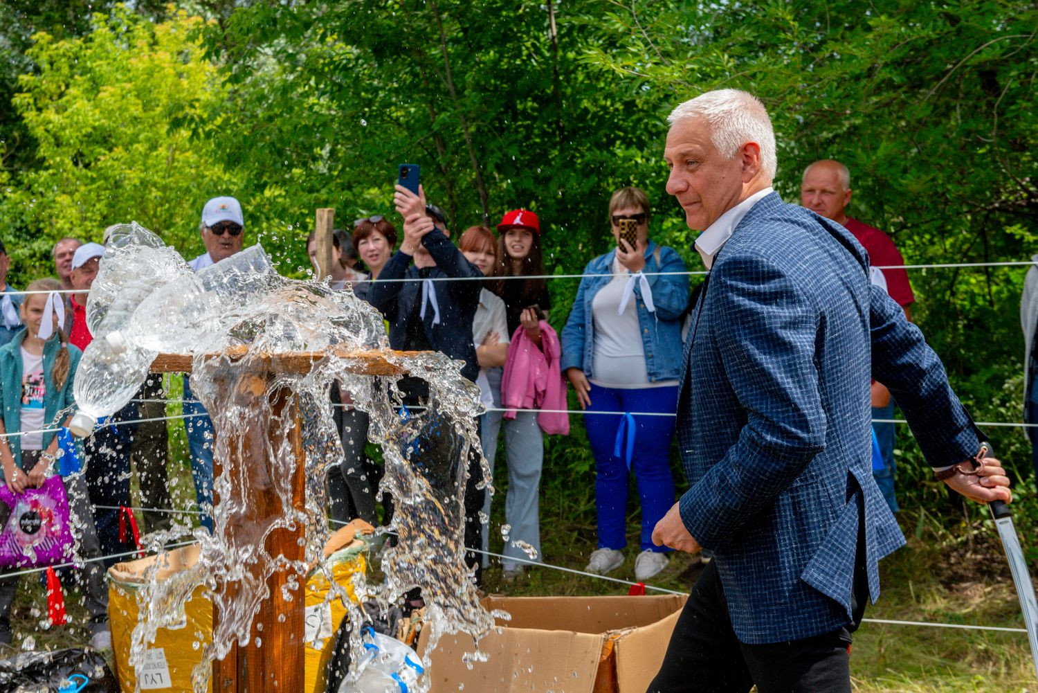 Для главы Магнитогорска и спикера МГСД организаторы приготовили особые испытания. Сергей Бердников разрубил казацкой шашкой стяжку пластиковых бутылок с водой, а Александру Морозову предстояло с завязанными глазами разбить палкой глиняный горшок.