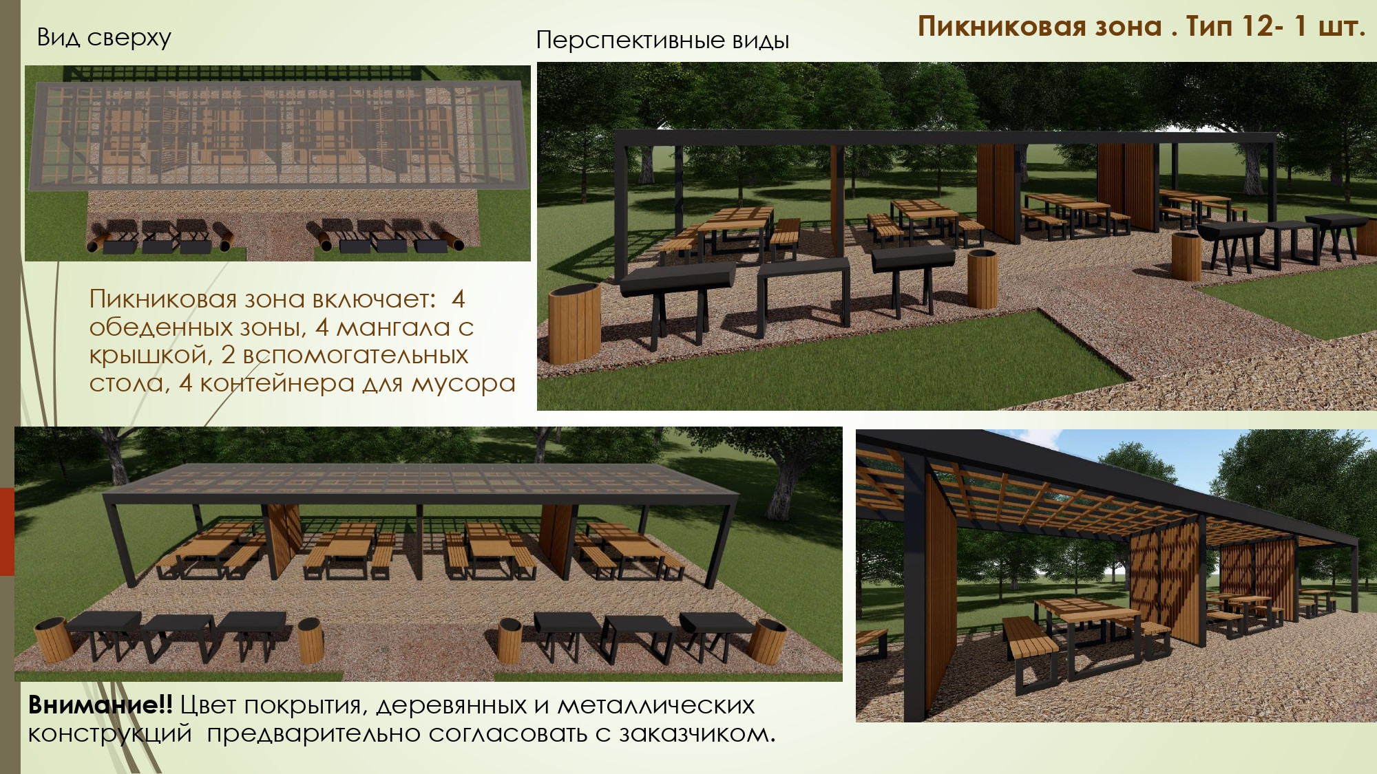 В парке установят сразу несколько видов лавочек разнообразной формы. Установят скамьи в виде шезлонгов, а также беседки. У некоторых зон отдыха будут навесы от солнца. Естественно, появятся в парке и урны.